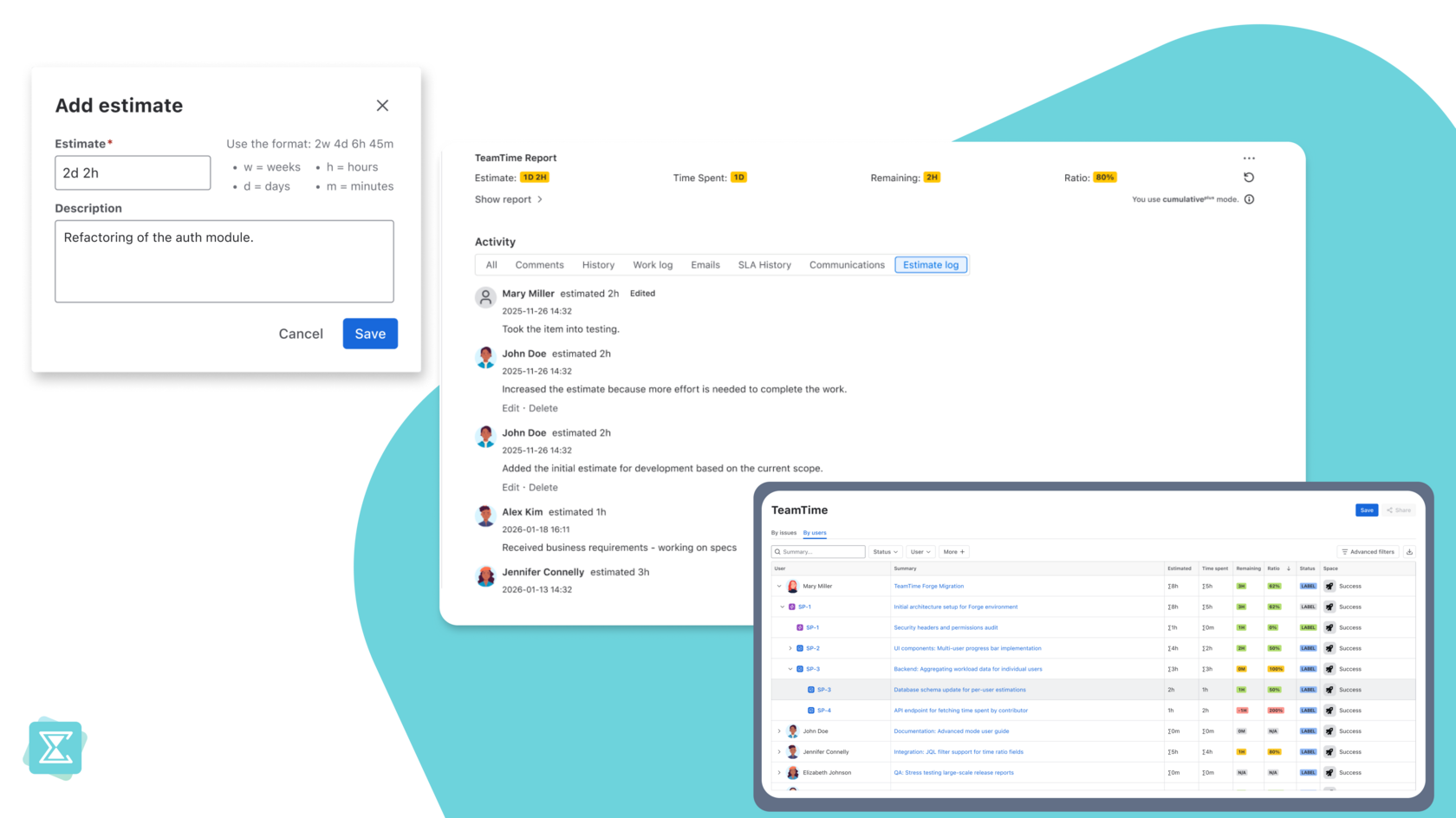 TeamTime Advanced introduces a professional resource planning layer. It treats Estimates with the same respect as Worklogs, allowing for a detailed breakdown of "Who" is estimated to do "What" and for "How much time".